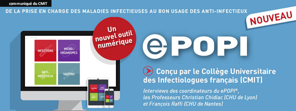 ePOPI® remplace désormais le POPI, guide de poche de thérapeutique anti-infectieuse et destinés aux praticiens, publié par notre Collège, le CMIT (Collège des universitaires de Maladies Infectieuses et Tropicales) et antérieurement actualisés tous les deux ans. En quoi ePOPI® constitue t-il un outil de référence ? ePOPI® résulte d'une expérience collégiale de plus de trente années, réalisé en toute indépendance, sans lien avec l'industrie ou tout autre organisme et sans publicité. Les informations contenues dans le ePOPI® sont consensuelles, ne reflètent pas l'avis d'une personne mais celui de toute une discipline, tout en tenant compte des recommandations les plus récentes. En cela ePOPI® est une référence et une garantie de qualité éditoriale pour toute la communauté médicale. Le site permet aussi de contacter un membre de notre comité scientifique sur toute question d'infectiologie. Avec le numérique, nous sommes entrés dans une ère plus collaborative, interactive, très utile en médecine.